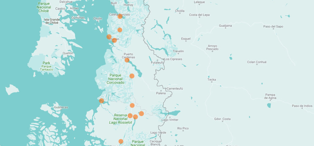 Coyhaique ~ Torres de Simpson ~ Villa Amengual ~ Puyuhuapi ~ La Junta (> Raul Marin de Balmaceda) ~ Lago Rosselot ~ Lago Claro Solar ~ Villa Santa Lucia (> Futalefu) ~ Puerto Cardenas ~ Chaiten ~ Playa Santa Barbara ~ Caleta Gonzalo > Hornopiren (Fähre) ~ Contao ~ Puerto Montt