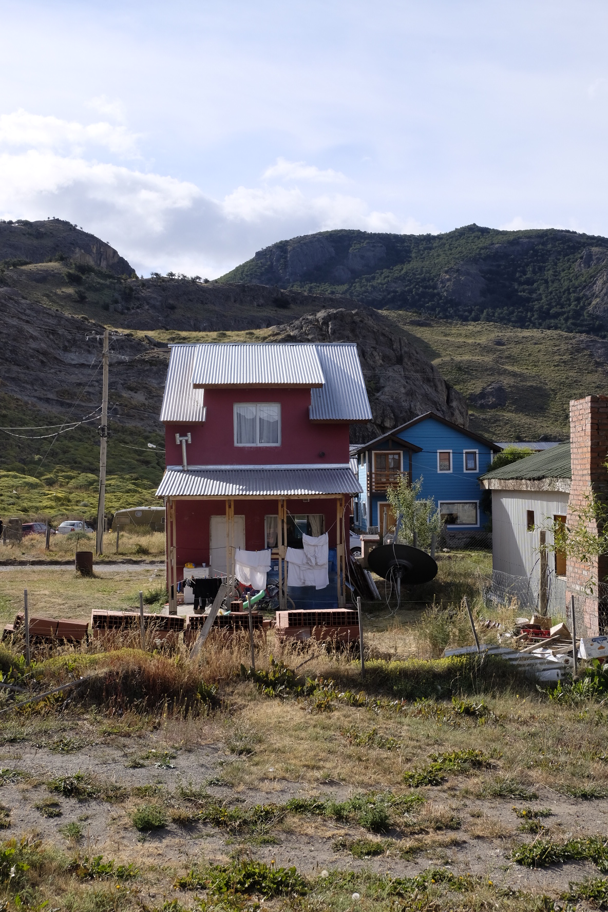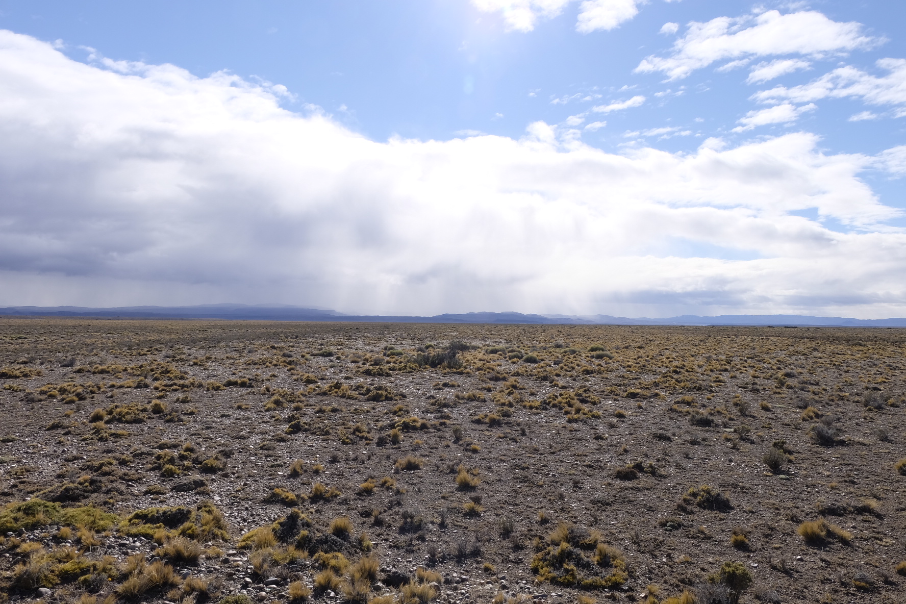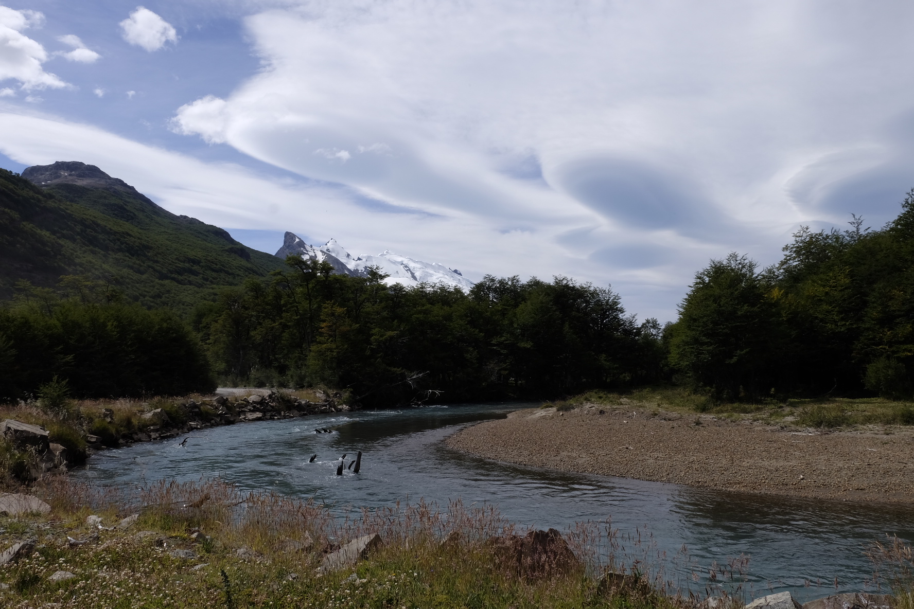 Ein paar Ruhetage später biegen wir auf die bekannte Ruta 40. Wir singen, wir lachen, wir jodeln. Ja, wir haben Rückenwind! Jodelidodeli. Links Straussen, rechts Guanacos. Sogar eine kleine Fähre überholt uns in dieser kargen Buschlandschaft. Was es nicht gibt. Und… nach 3 Stunden kehrt der Wind. Am Himmel schweben Wolken-Raumschiffe (sei ein Zeichen für starke Winde in der Höhe…hier auch am Boden). Wir fluchen, wir strampeln, wir geben auf. Bei einer Estancia dürfen wir im Windschutz zelten. Zwei Fahrtage später, nach weiteren Kilometer auf der endlosen Ruta 40, geben wir wirklich auf. Massive Böen werfen uns mitten auf die Strasse. Zu gefährlich. Lieber Daumen hoch. Im Kofferraum eines Lieferwagens strecken wir die Beine aus und essen Alfajores. Doch, das haben wir uns verdient! Und die paar Tage Pause in los Antiguos am Lago Buenos Aires auch! Und der Bus nach Calafate auch! Und zum Glaciar Perito Moreno auch! Und nach Chalten auch!