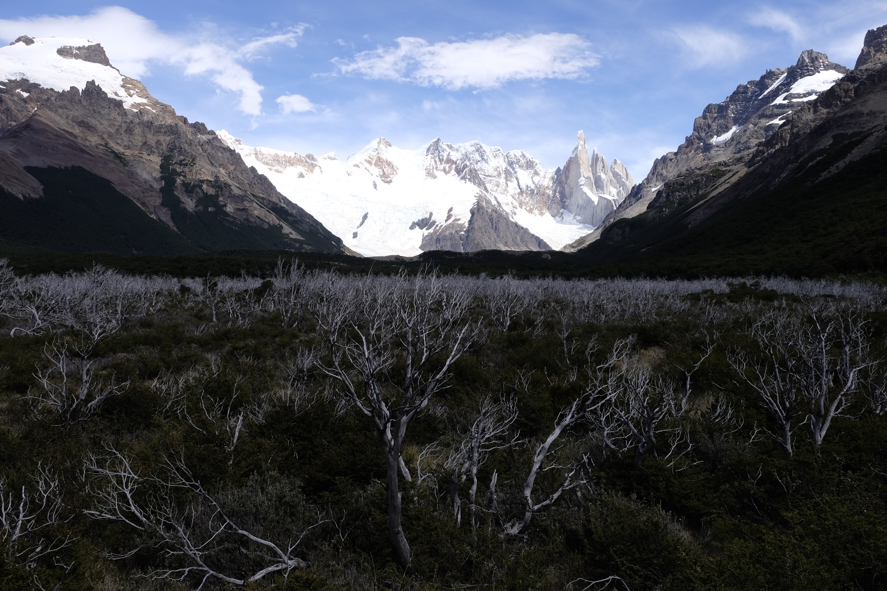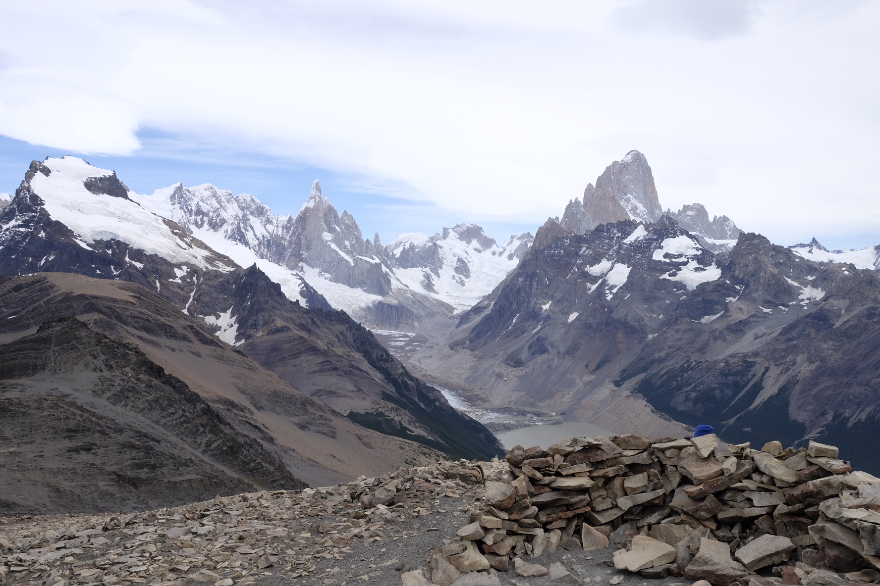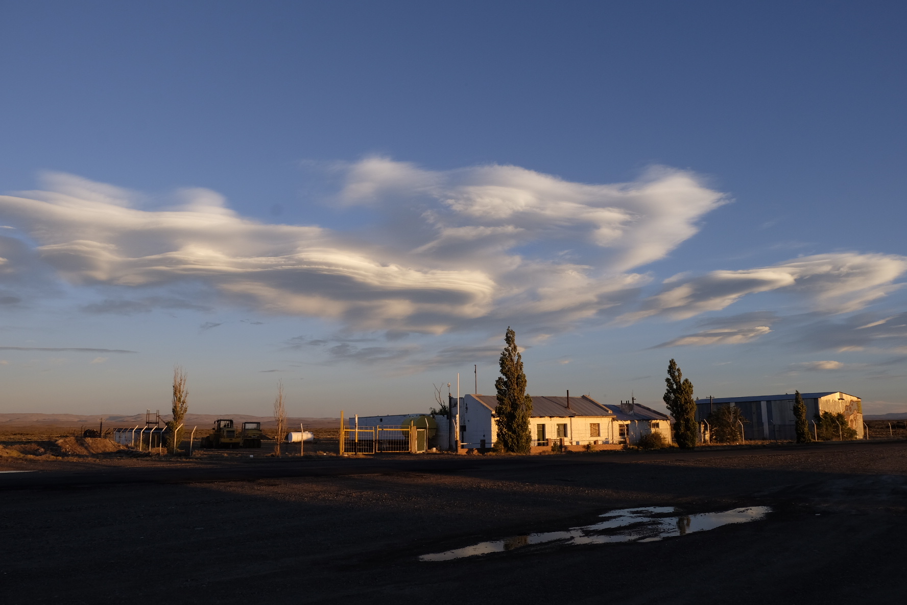 Ein paar Ruhetage später biegen wir auf die bekannte Ruta 40. Wir singen, wir lachen, wir jodeln. Ja, wir haben Rückenwind! Jodelidodeli. Links Straussen, rechts Guanacos. Sogar eine kleine Fähre überholt uns in dieser kargen Buschlandschaft. Was es nicht gibt. Und… nach 3 Stunden kehrt der Wind. Am Himmel schweben Wolken-Raumschiffe (sei ein Zeichen für starke Winde in der Höhe…hier auch am Boden). Wir fluchen, wir strampeln, wir geben auf. Bei einer Estancia dürfen wir im Windschutz zelten. Zwei Fahrtage später, nach weiteren Kilometer auf der endlosen Ruta 40, geben wir wirklich auf. Massive Böen werfen uns mitten auf die Strasse. Zu gefährlich. Lieber Daumen hoch. Im Kofferraum eines Lieferwagens strecken wir die Beine aus und essen Alfajores. Doch, das haben wir uns verdient! Und die paar Tage Pause in los Antiguos am Lago Buenos Aires auch! Und der Bus nach Calafate auch! Und zum Glaciar Perito Moreno auch! Und nach Chalten auch!