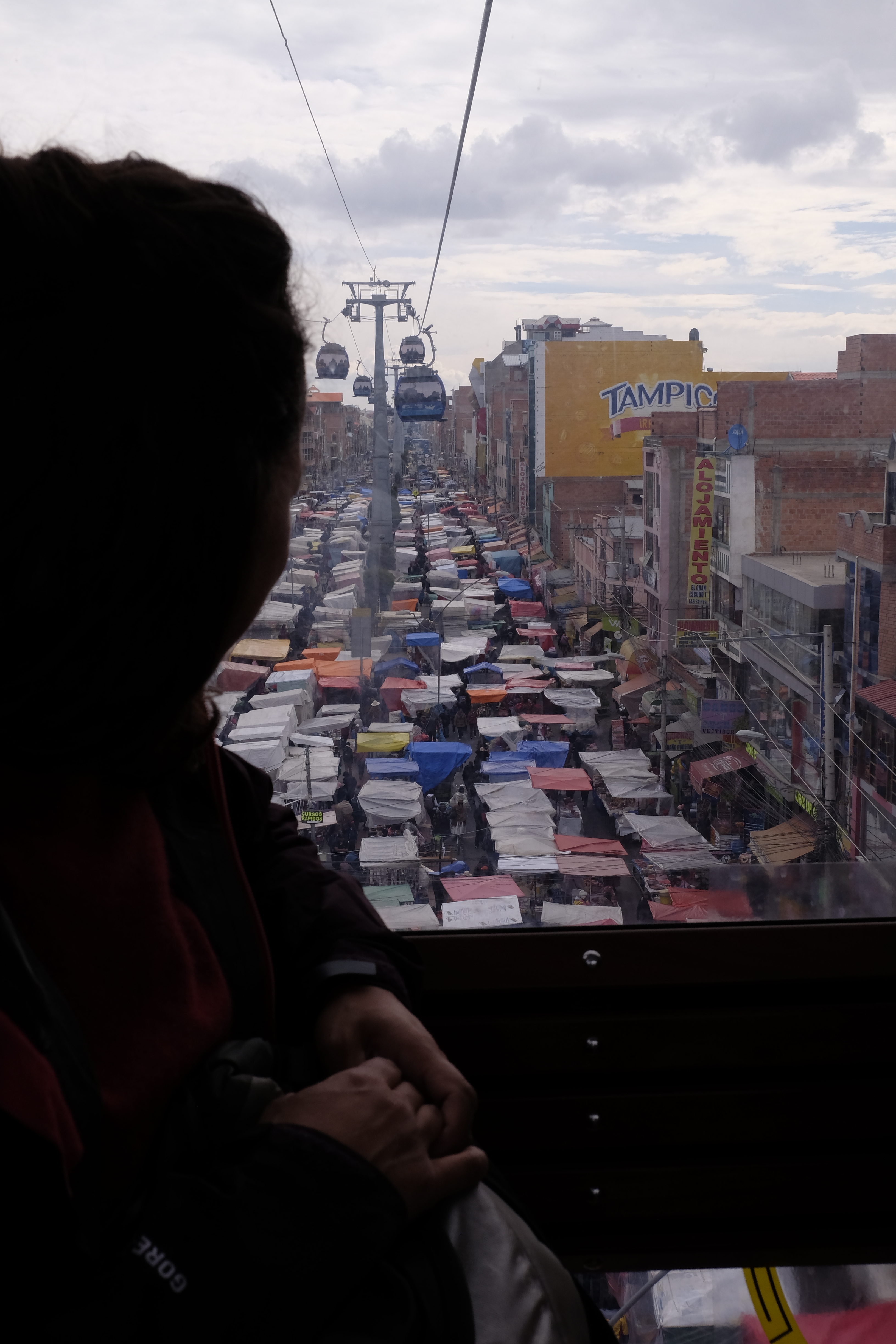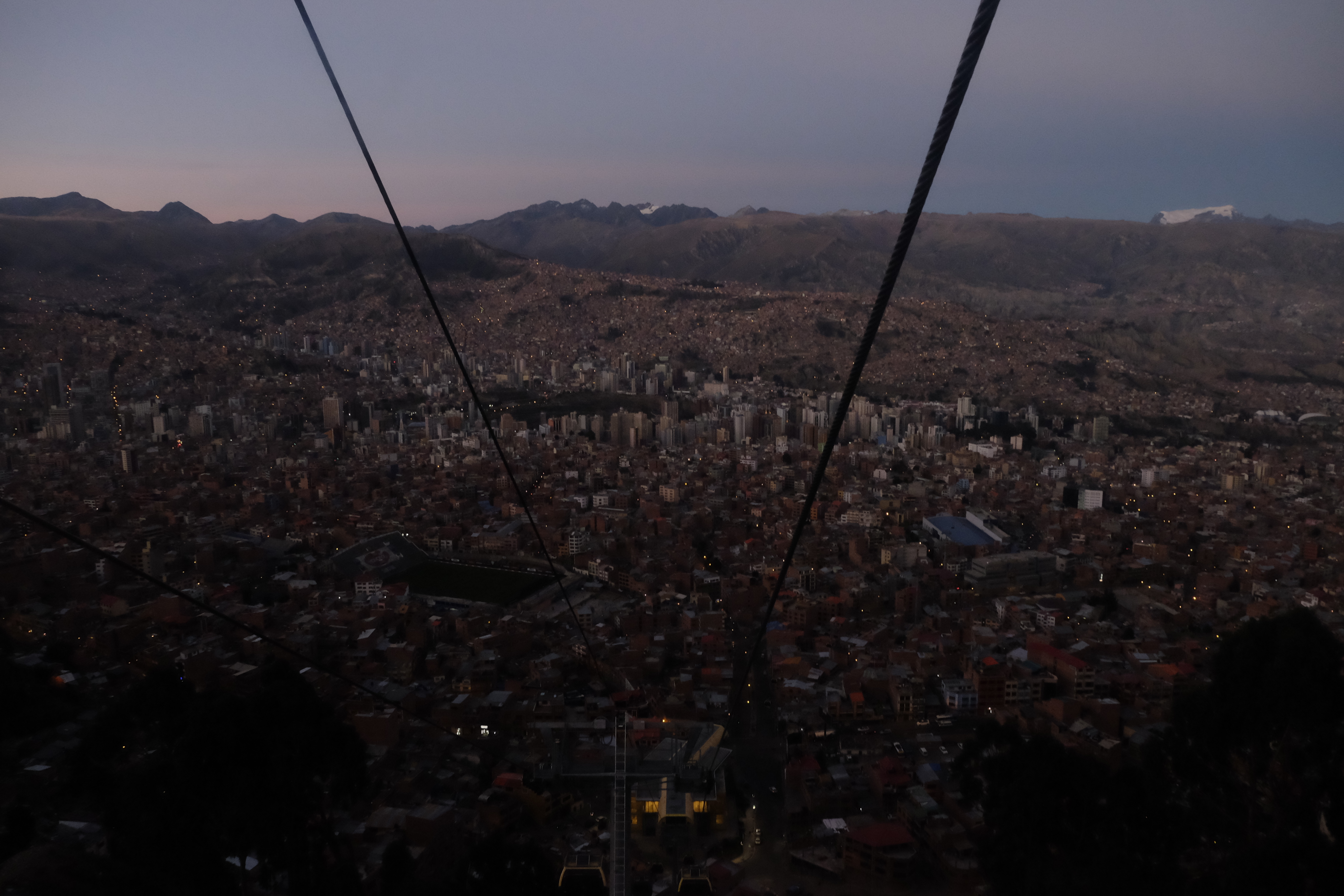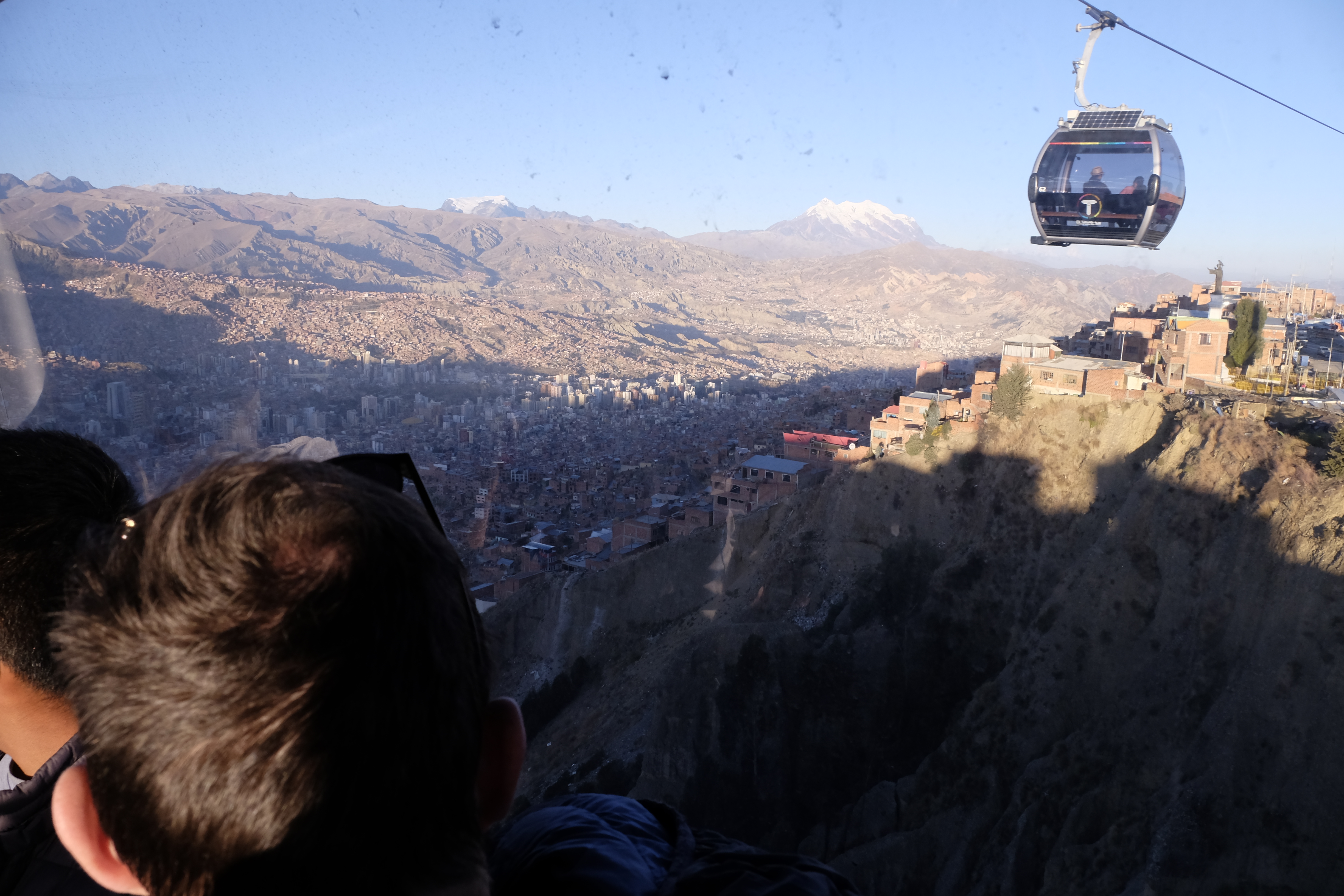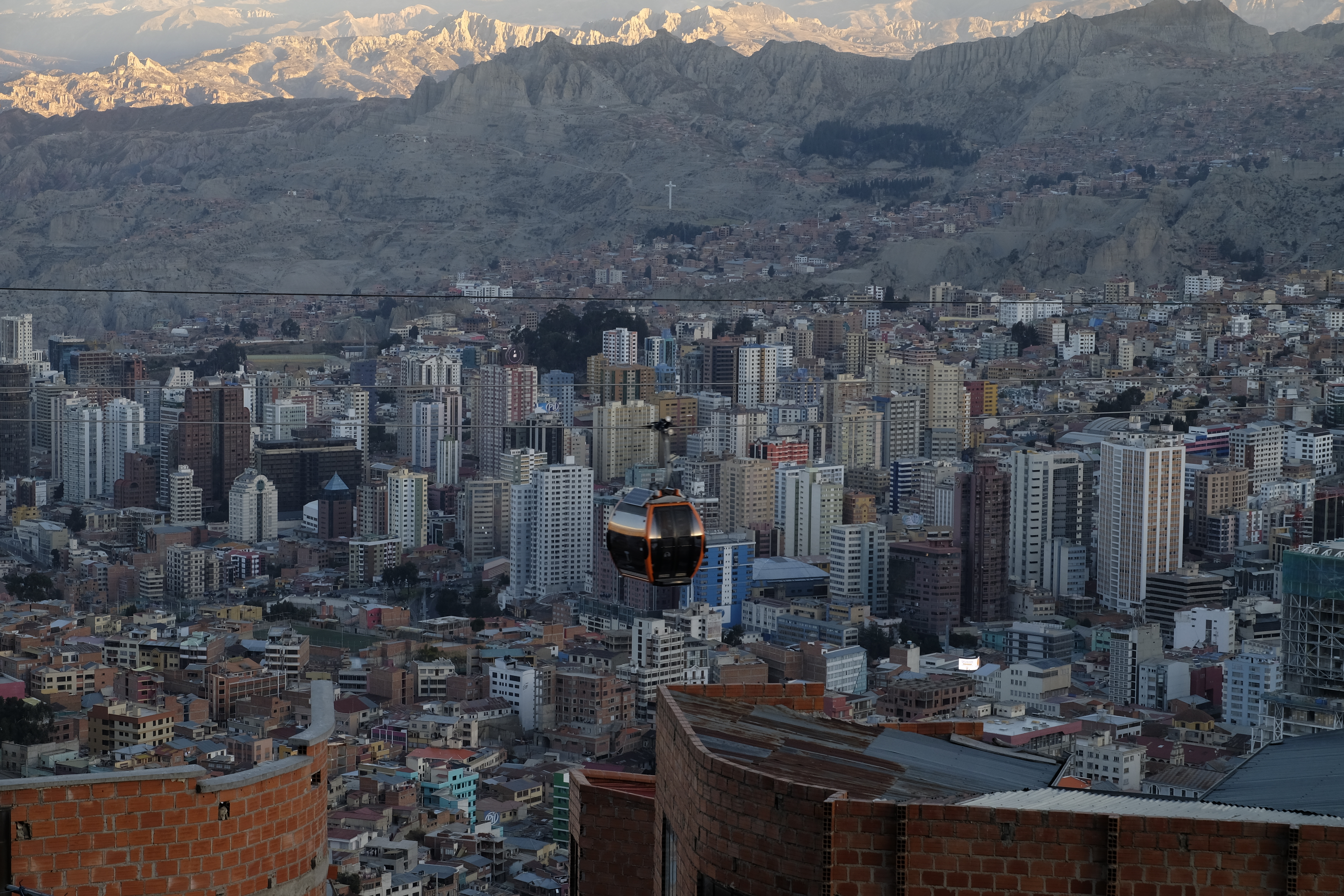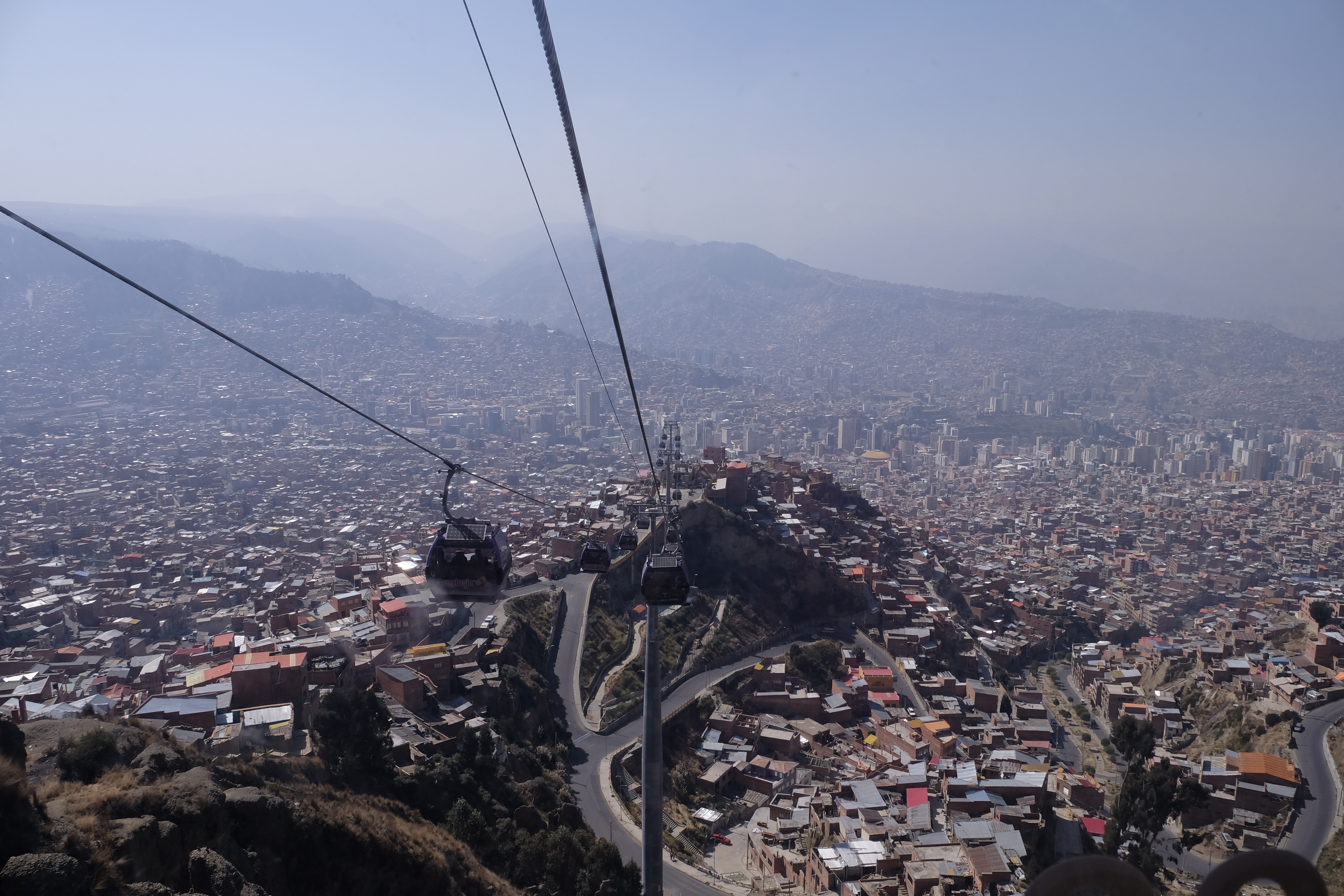 Nach 5 Monaten verlassen wir Chile. Wie gut uns dieses abwechslungsreiche Land mit den gastfreundlichen Leuten gefallen hat, konnte hoffentlich unseren Geschichten und Bilder entnommen werden. Trotzdem: Je näher wir Bolivien kommen, desto mehr freuen wir uns auf einen kulturellen Wechsel, auf farbige Buse, traditionelle Märkte, Dschungel und natürlich auf die Chance, auf einer Kaffeeplantage mitzuwirken. Doch bevor wir all dies spüren dürfen, spüren wir unsere Köpfe. Kaum in La Paz angekommen, brummen sie so richtig. Von 0 auf 3‘700hm (Caldera – La Paz) verkraften wir nicht ohne Weiteres. Es fehlt schlicht und einfach an Sauerstoff. Die ersten Treppen sind kaum zu meistern. Während Tagen begleitet uns leichtes Unwohlsein. Sogar der sonst so treue Begleiter «Appetit» vergeht uns kurzzeitig. Grund genug, diese in steile Hänge gebaute Stadt per «Teleféricos» zu erkunden. Ca. 8 Gondeln verbinden die verschiedenen Stadtteile, welche zwischen ca. 3‘200 und 4‘200 Höhenmeter liegen. In Schweizer-Alpen-Manier fliegen wir zwischen Hochhäuser, unter Brücken, über chaotische Strassen und unzählige Innenhöfe, über Fussballfelder, architektonisch eigenwillige, imposante Bauten (von Architekt Mamani) und endlose Märkte. Während Stunden beobachten wir das Treiben dieser bunten, lebendigen Stadt vom Himmel aus. Und gondelhafte Aussichten geniessen wir auch bei einem kurzen Ausflug in die Umgebung oder von unserer ersten Bleibe aus. Bastian, unser Schwedischer (super) Warmshower Host machts möglich. Danke nochmals für alles!