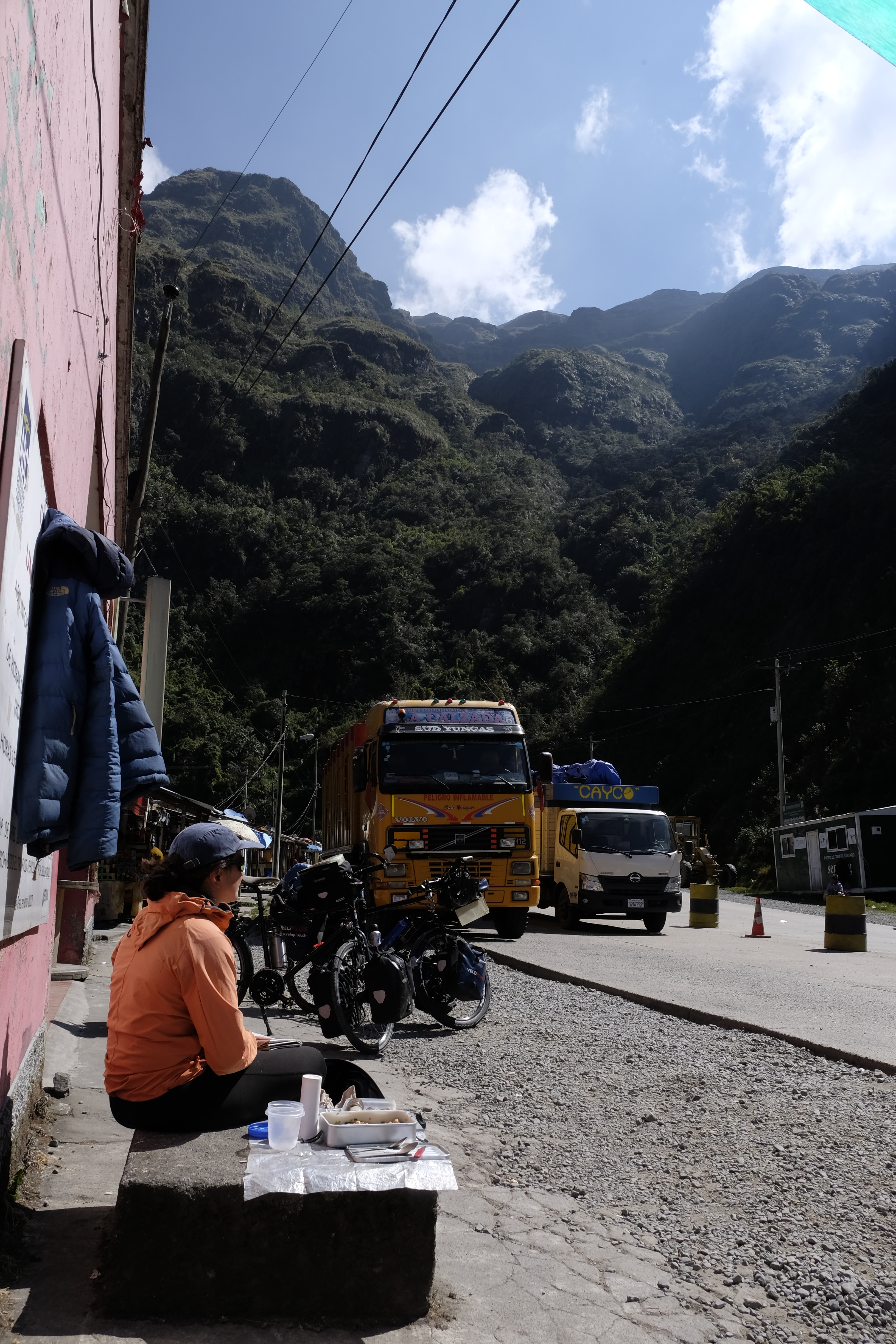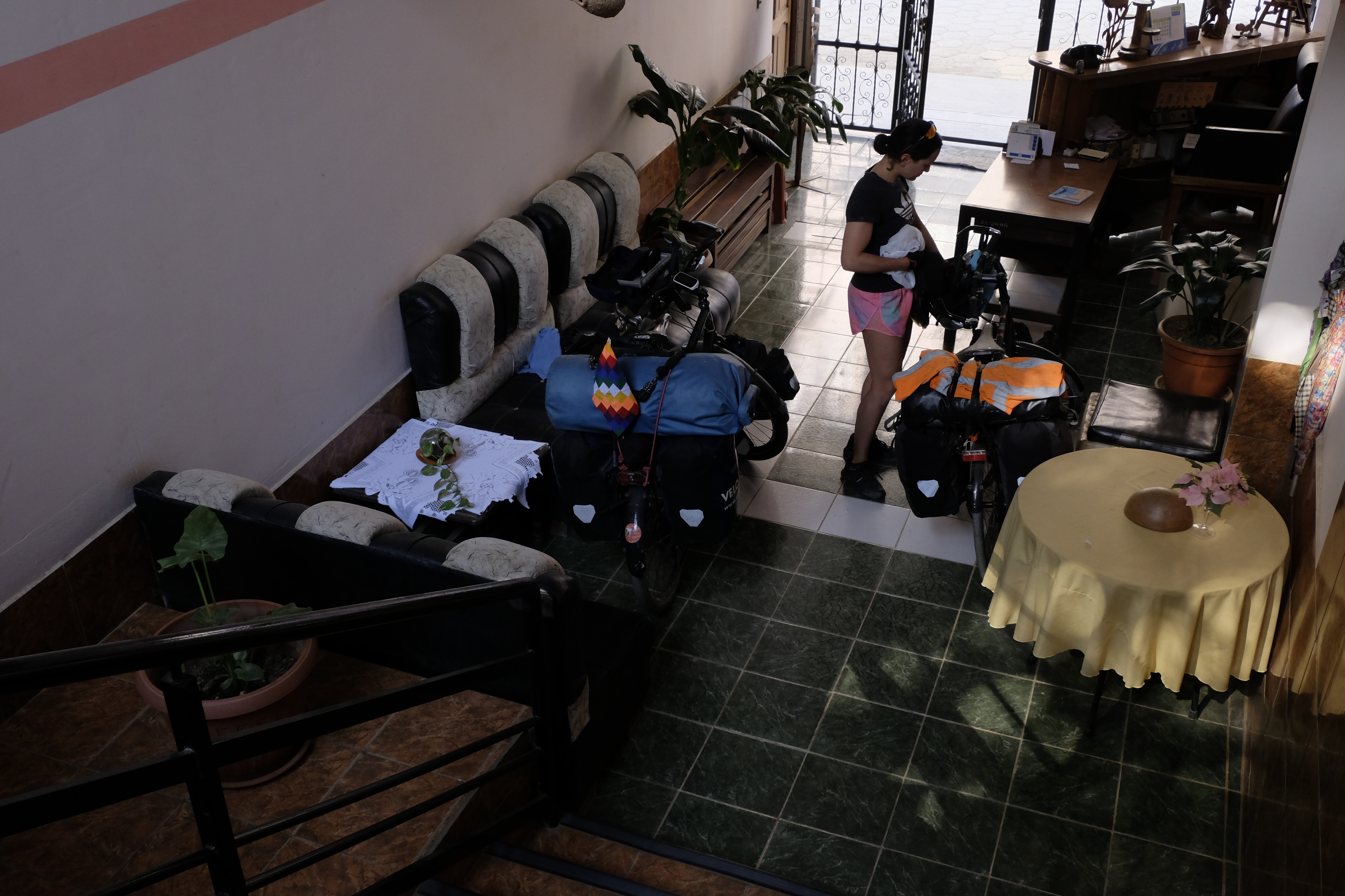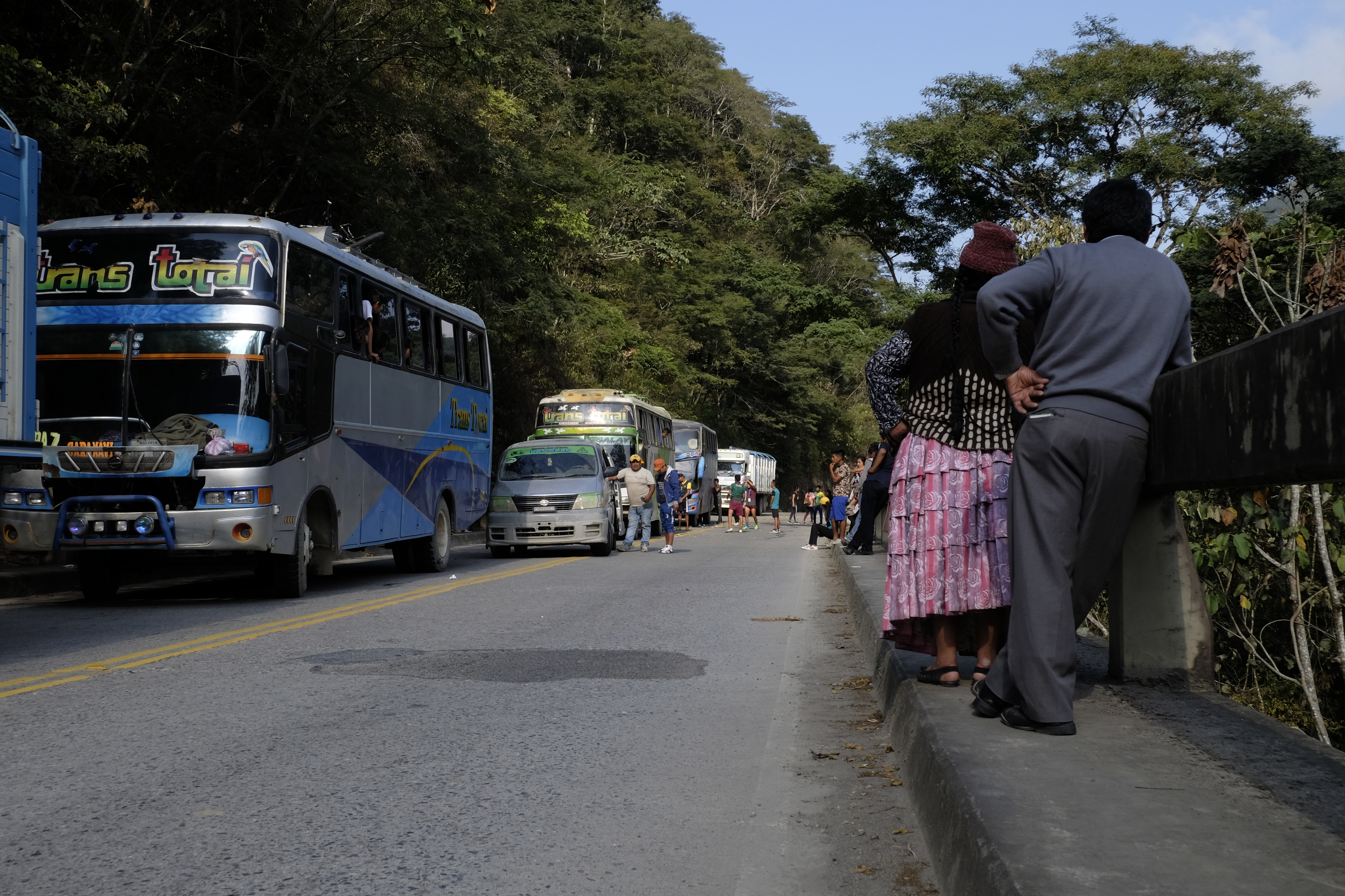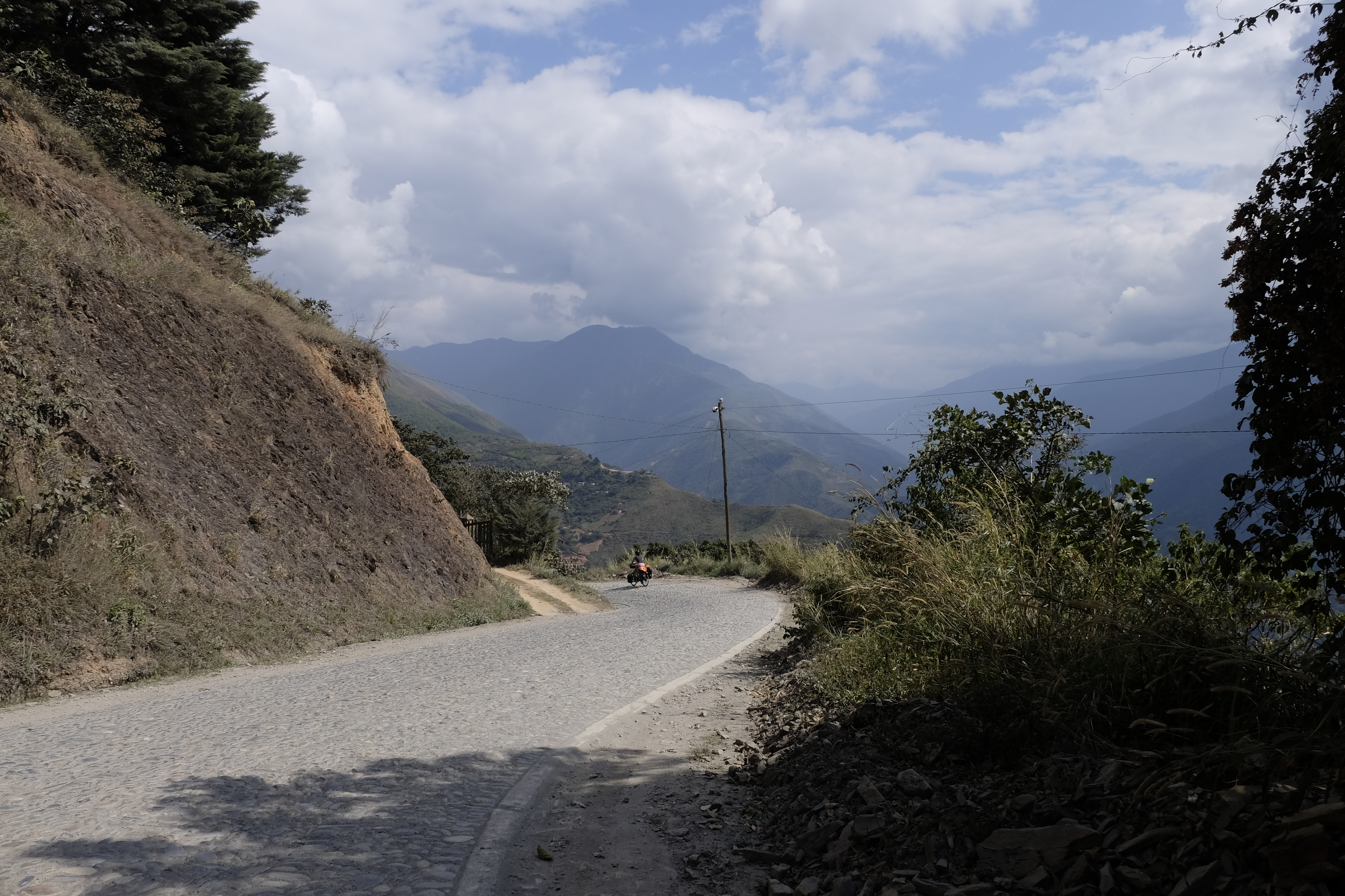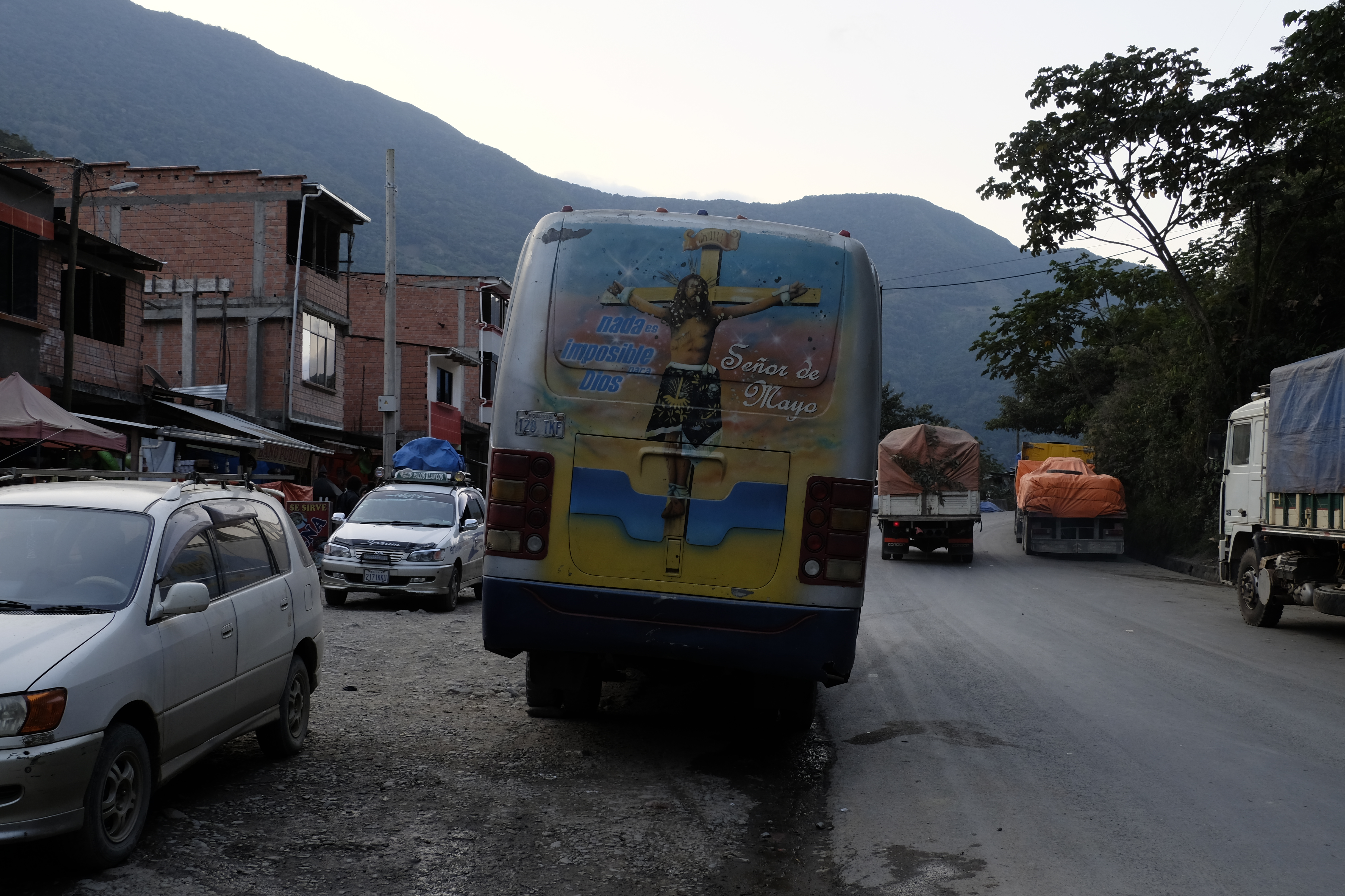 Weil Bastian beruflich weiterzieht, ziehen wir ins Casa de Ciclista um. Unser Zimmer verliert dramatisch an Standard, aber spannende Leute treffen wir auch hier. Wir werden überzeugt, die Rute La Paz – Caranavi mit dem Velo zurückzulegen. Auf dieser Strecke liege die berühmte «Carretera de la Muerte». Dank einer neuen Umfahrtstrasse jetzt eher turistisch als gefährlich. Landschaftlich jedoch traumhaft. Heute können wir schreiben: wir habens versucht. Weil Wahljahr wird protestiert. Auf unserer Strecke mit Strassenblockaden (Coca-Bauern fordern die Legalisierung weiterer Anbaugebiete). Unser Veloeinstieg in Bolivien scheitert daher kläglich nach ein paar Kilometern. Aus Sicherheitsgründen wechseln wir in einen Bus (die Dynamitsprengungen schüchtern uns doch etwas ein). Sobald die Polizei die Strasse freigibt, zweifeln wir an unserer Entscheidung. Passstrasse, Nebel, keine Leitplanke. Egal, es wird gerast und überholt als gäbe es kein Morgen. Doch weit kommen wir auch im Bus nicht. Eine Sperre kommt scheinbar selten alleine. Es steht eine ungemütliche Nacht im Bus, einen Tag wartend am Strassenrand und eine weitere (diesmal erholsame) Nacht in einem Hotel in Coroico bevor. Als wir mit zwei Tagen Verspätung in Caranavi eintreffen, sind wir erleichtert. Die Carretera de la Muerte haben wir zwar verpasst. Dafür sitzen wir nun in einem gemütlichen Hotel mit schönen Innenhof (hier verbringen wir auch das Wochenende zwischen unseren Arbeitsaufenthalten).