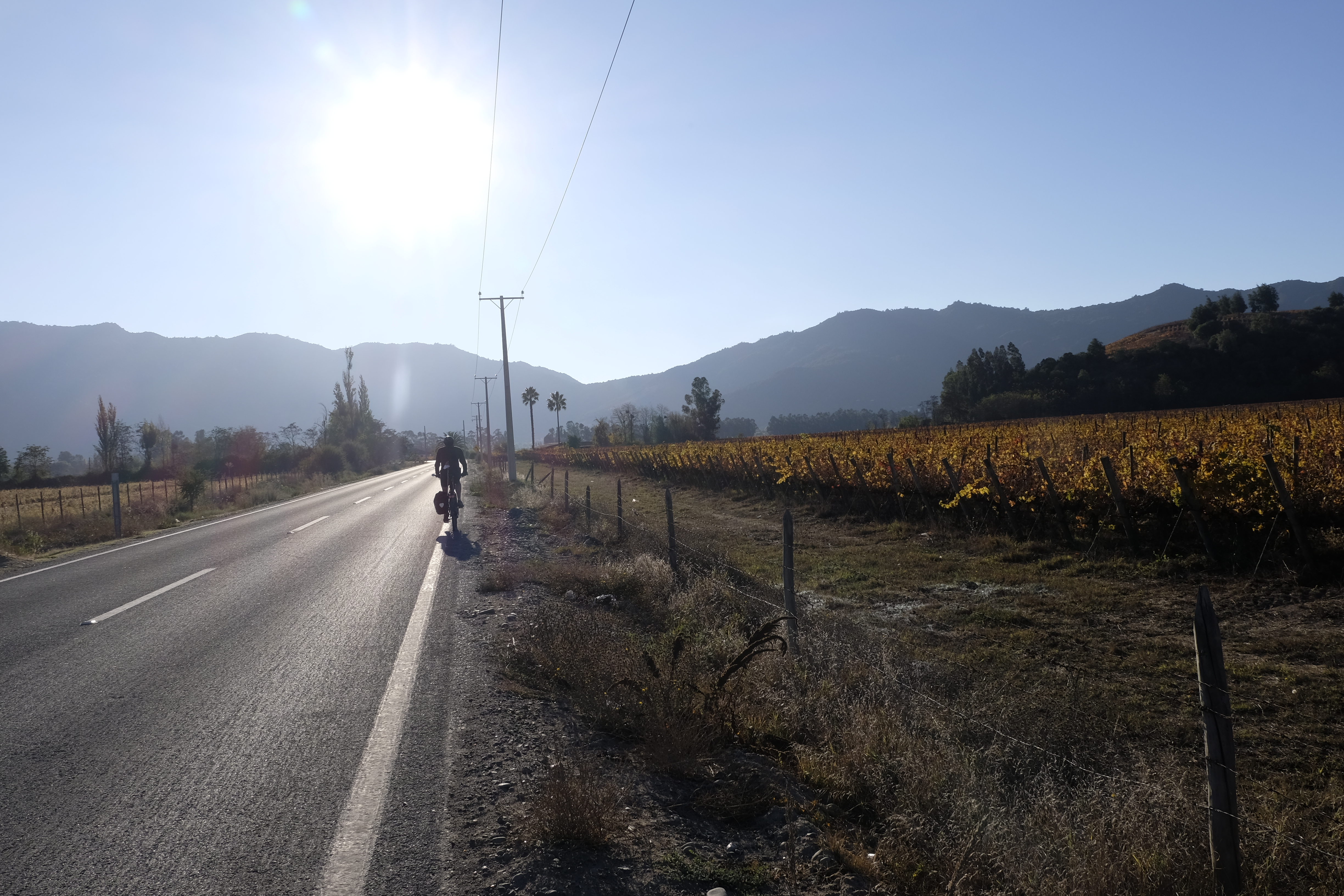 Von Pichilemu aus erobern wir ein paar letzte Hügel Richtung Landesinnere. Das Landesinnere, wie so oft, eine reine Eukaliptus- und Pinienholzfabrik. Monokulturen so weit der Horizont reicht. Doch plötzlich ein abrupter Wechsel: wir gleiten durch schimmerndes Rot, leuchtendes Gelb und welkendes Grün. Willkommen in der noblen Weinregion Santa Cruz. Willkommen in der Farbenpracht herbstlicher Rebberge. Drei Tage geniessen wir den wärmenden Ausblick bei kurzen Velofahrten, lehrreicher Weintour, und, wer hätts gedacht, zu einem Glas guten Carménère.