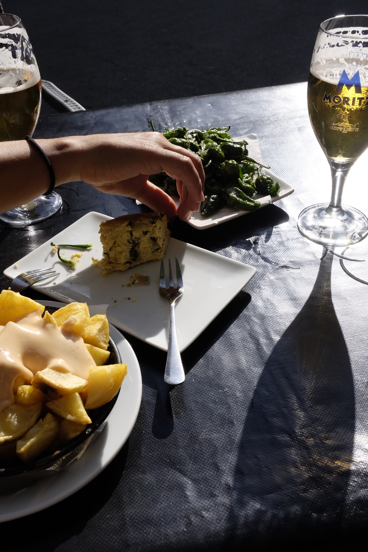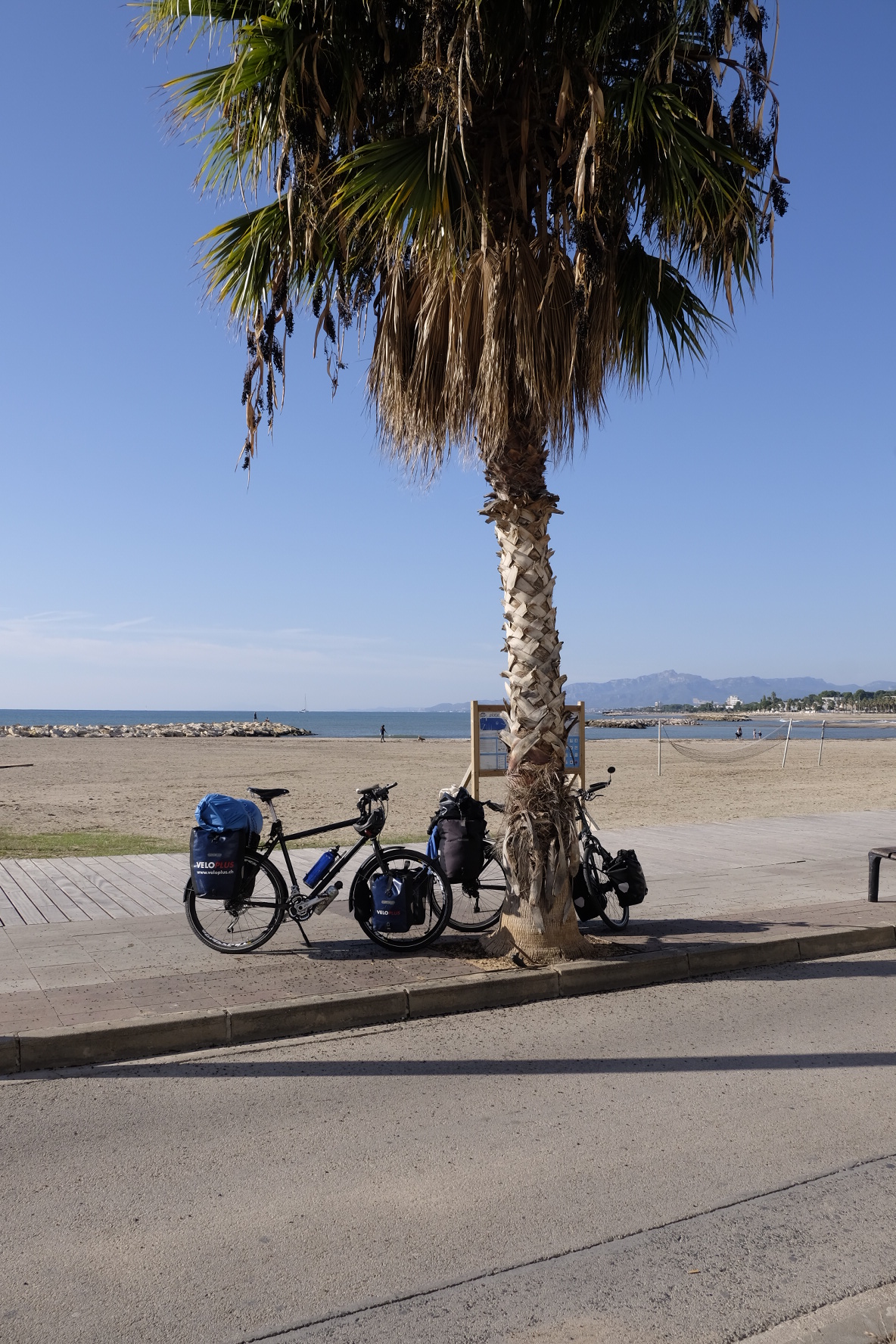 Weniger schön waren die autobahnähnlichen Überlandstrassen. Kilometerweise schlichen wir uns ängstlich den Pannenstreifen entlang. Die Erlösung kam in Form eines kleinen Velocomputers: Dem Garmin. Man hätte es nur fragen müssen…seit Beginn der Reise klebt es vor meiner (Sams) Nase. Nun geht es entlang von Strandpromenaden oder zu Velorouten umgewandelten Zuggeleisen, vorbei an Dörfli mit Stierspektakel oder papas bravas y cerveca (ok, selten einfach vorbei). Que bien!