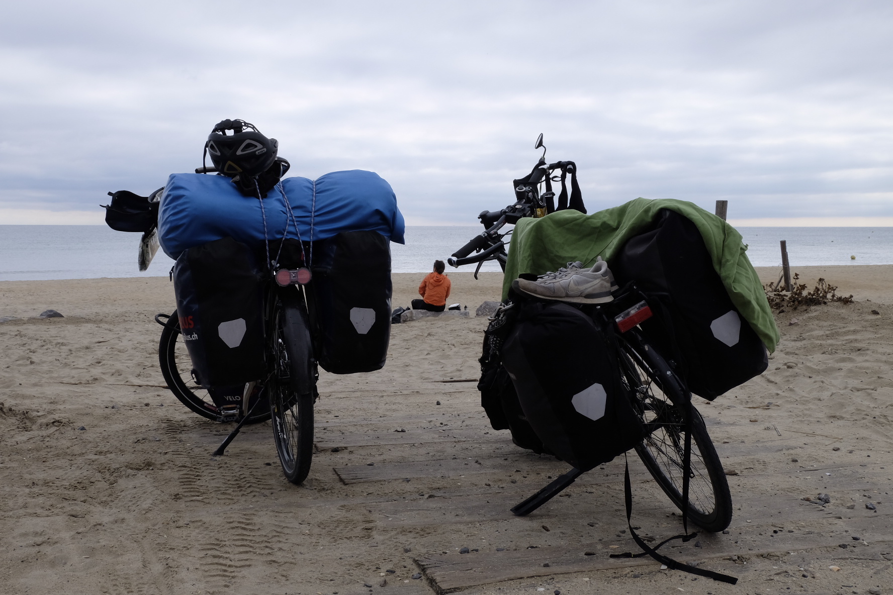 Kurz vor dem Meer dann traumhafte Seelandschaften. Hier Störche, da riesige Wasserraten. Sogar Flamingos stolzieren herum. Mit dem Velo gehts mittendurch. Entlang von vielbefahrenen Kanälen. Die Franzosen lieben ihre Hausboote. Am Meer werden einsame Naturschutzgebiete durch skurile Plan-Ferienstädte unterbrochen. Ein ständiger Begleiter ist der Regen. Aus Baden und Surfen wird leider nichts. Nur Schlammbäder für die Velos.
