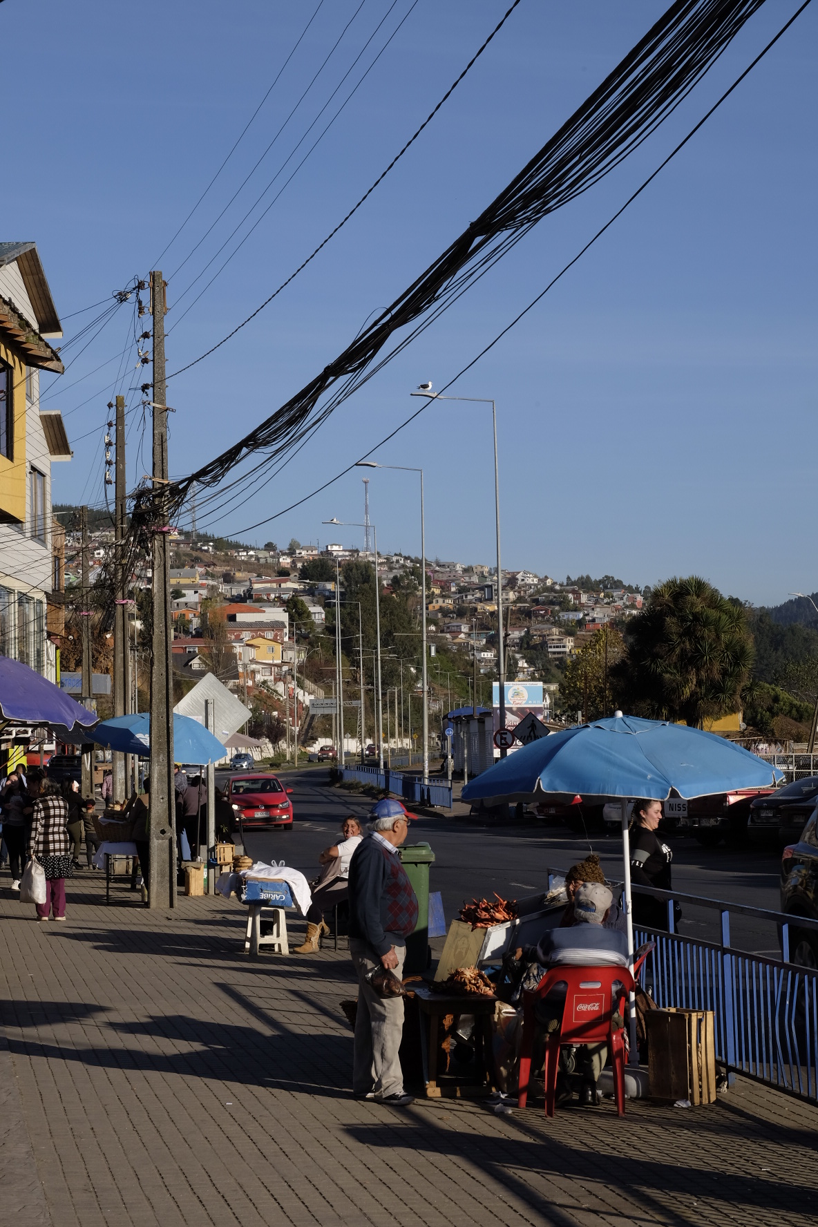 Puerto Montt. Das Ende der Carretera Austral. Gefühlslage zwischen Trauer und Freude. Trauer über den Verlust gefühlt grenzenloser Natur, viel Einsamkeit und gute Bekanntschaften. Freude über das Geleistete, über das Bevorstehen eines neuen Abschnittes und den vermutlich kommenden Wechsel hin zu warmem und trockenem Wetter. Mit Pisco-Sour wollen wir auf Freude und Trauer anstossen. Doch Puerto Montt ist für „Carretera AustralerInnen“ was Hong Kong für gemütliche BernerInnen ist: überfordernd. Wir verschieben PiscoSour und fliehen vor Auto-, Häuser- und Menschenmassen in die Los Lagos Region. Die Region mit Seen und Vulkanen. Und wir werden nicht enttäuscht. Vor Vulkanen bietet alles einen spektakulären Anblick: herausgeputzte Kleinstädte, Seepromenaden, prächtige Holzvillen, Campingplätze oder einfach eine Kuhherde. Nur sieht man sie leider selten. Der gewünschte Wetterwechsel bleibt aus. Nach ca. 5 Tagen mit vermehrt Regen (wir werden aus Mitleid schon zum zMittag eingeladen) und richtig kalt-nassen Nächten haben wir genug. Wir wollen Wärme, Sonne und Palmen. Zu finden? Hoffentlich an der Küste. Wir kürzen ab und rasen von Osorno mit Bus nach Valdivia.