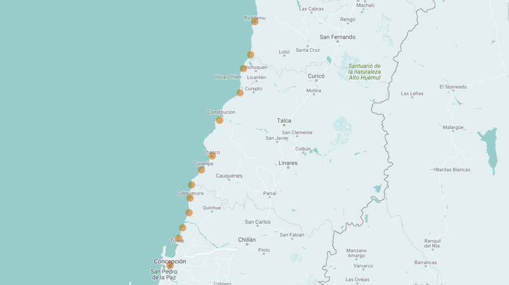 Puerto Montt ~ Puerto Varas ~ Frutillar ~ Puerto Octay ~ Entre Lagos ~ Osorno ~ Valdivia ~ Concepcion – Dichato ~ Alto Perales ~ Cobquecura ~ Pullay ~ La Punta Sirena ~ Chanco ~ Constitución ~ Camping Municipal Curepto ~ Duao ~ Boyecura ~ Pichilemu